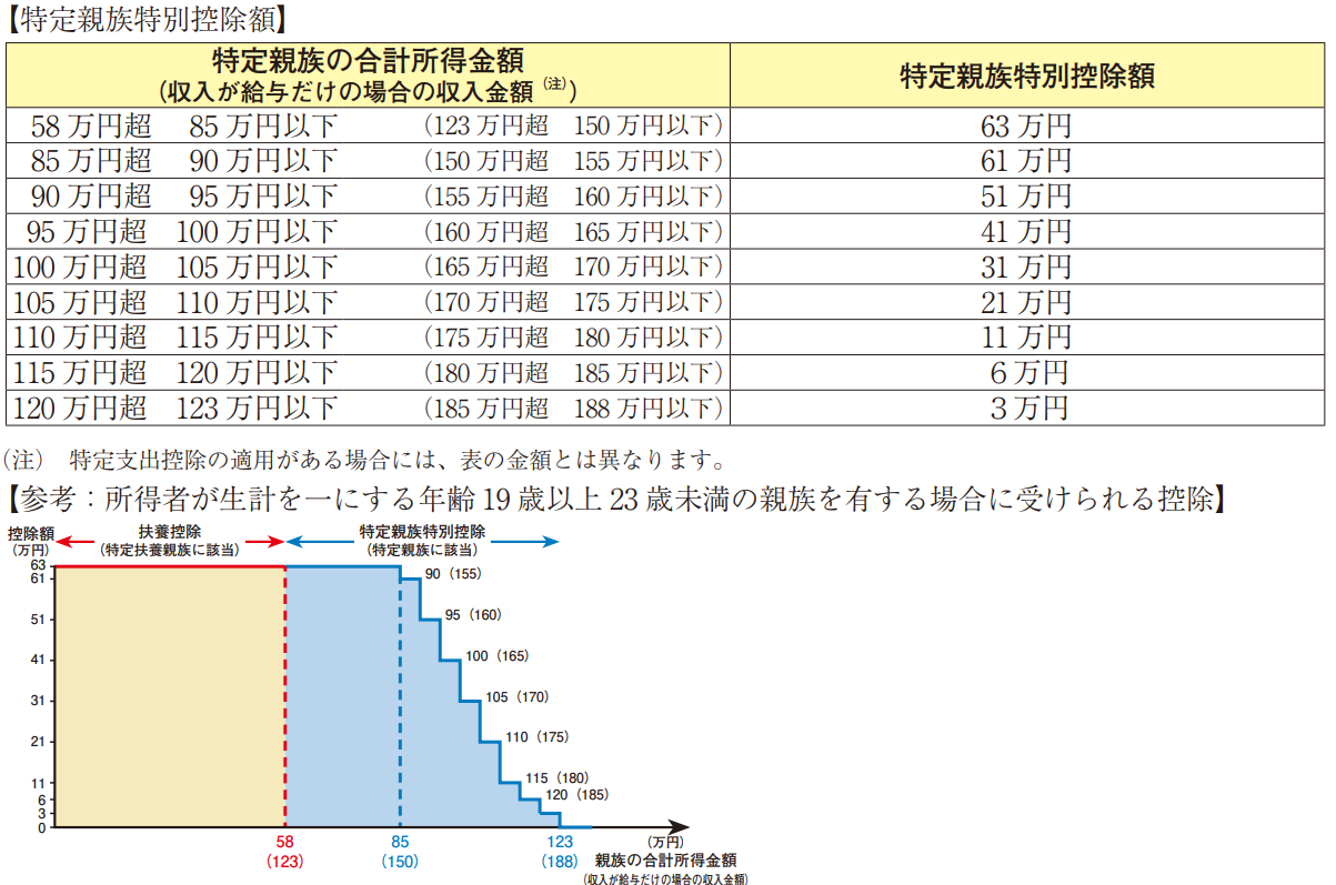 なお、親族の合計所得金額が 58 万円以下の場合は、特定親族特別控除の対象とはなりませんが、扶養控除の対象となります(年齢 19 歳以上 23 歳未満の親族は特定扶養親族に該当し、扶養控除額は 63 万円です。