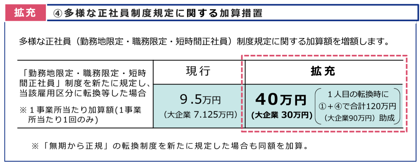 また、多様な正社員(勤務地限定・職務限定・短時間正社員)制度規定に関する加算額が増額されます。