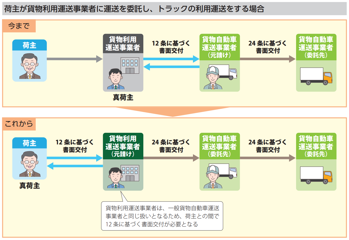 - 真荷主とトラック事業者が運送契約を締結するときは、相互の書面交付(法第12条)