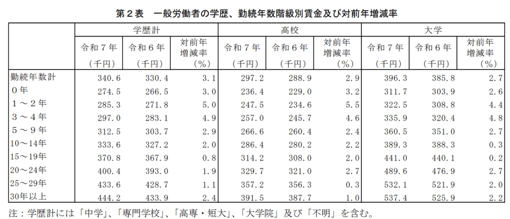 厚生労働省が令和7(2025)年賃金構造基本統計調査速報を公表しました。賃金構造基本統計調査は、主要産業に雇用される労働者について、その賃金の実態を労働者の雇用形態、就業形態、職種、性、年齢、学歴、勤続年数、経験年数別等に明らかにするものです。