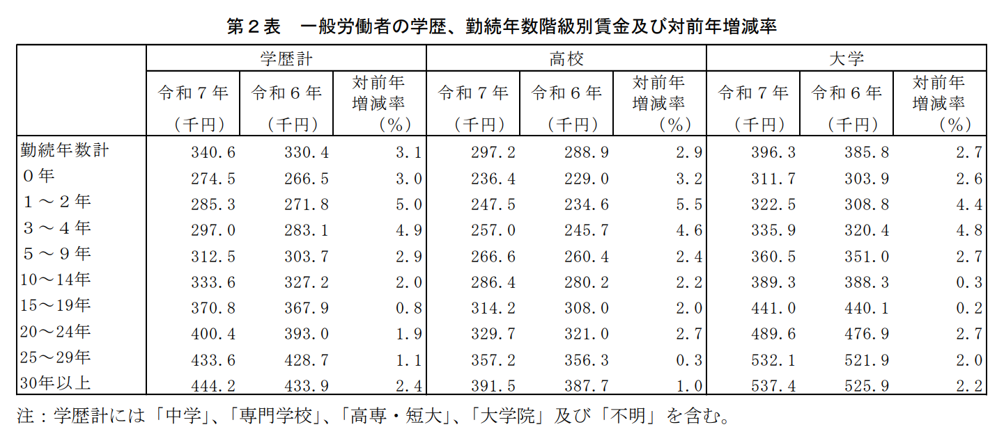 厚生労働省が令和7(2025)年賃金構造基本統計調査速報を公表しました。賃金構造基本統計調査は、主要産業に雇用される労働者について、その賃金の実態を労働者の雇用形態、就業形態、職種、性、年齢、学歴、勤続年数、経験年数別等に明らかにするものです。