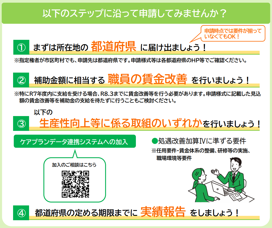 さらに介護職員以外の職員にも月額1.0万円相当が、6か月分補助されます。申請の手順は、下図の通り、介護職員の場合と同様です。