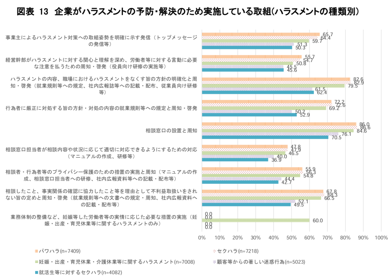 一方、企業の対応としては、ハラスメントの種類を問わず、予防・解決のために実施している取組として、「相談窓口の設置と周知」の割合が最も高く、次いで「ハラスメントの内容、職場におけるハラスメントをなくす旨の方針の明確化と周知・啓発」であった。前者は約7割以上の企業が、後者は約6割以上の企業が、各ハラスメントに対して実施していました。