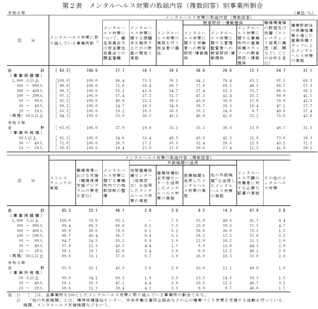 1のメンタルヘルス対策に関する状況については、メンタルヘルス対策に取り組んでいる事業所の割合は63.2%(令和5年調査63.8%)、事業所規模別にみると、労働者数50人以上の事業所で94.3%(同91.3%)、労働者数30~49人の事業所で69.1%(同71.8%)、労働者数10~29人の事業所で55.3%(同56.6%)と、規模が大きいほど取り組んでる割合が多いことがわかりました。