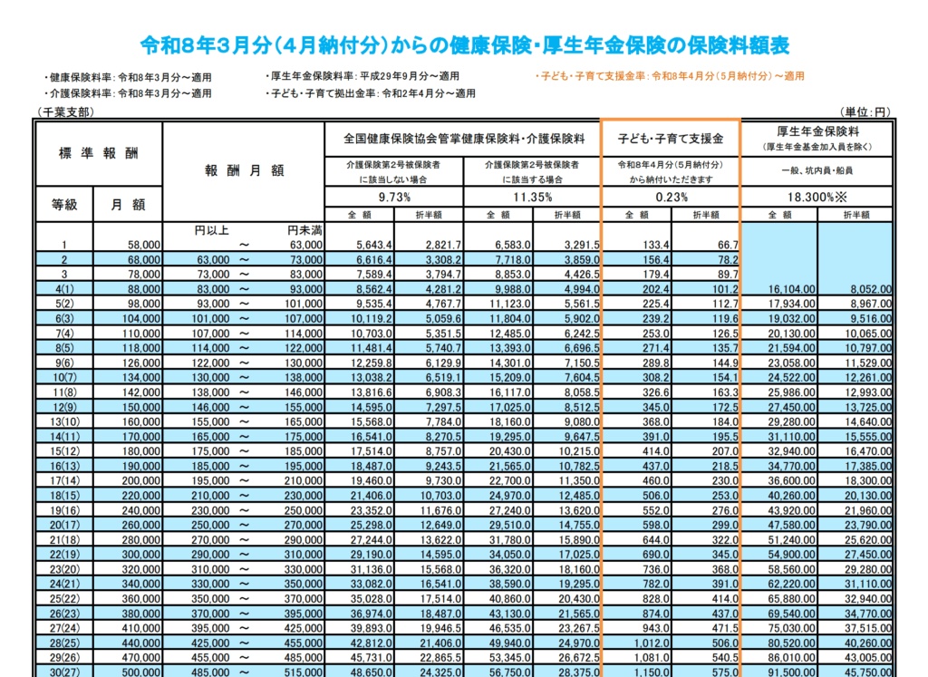 公表された都道府県ごとの社会保険料率表では「子ども子育て支援金」の欄が作成されています。