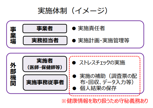 労働者のプライバシー保護の観点から、原則、外部委託による実施が推奨されます。そこで、委託先との契約・連絡調整等を行う実務担当者を指名します。個人結果等の健康情報の取扱は外部機関で完結し、事業場内では取り扱いません。実務担当者には、衛生推進者または安全衛生推進者を選任することが望まれるとされています。