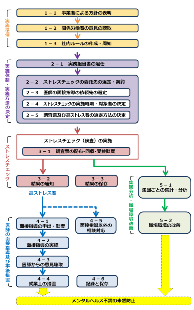 労働安全衛生法に基づくストレスチェック制度の主な目的は、労働者のメンタルヘルス不調の未然防止で、次のような流れで実施することが想定されています。