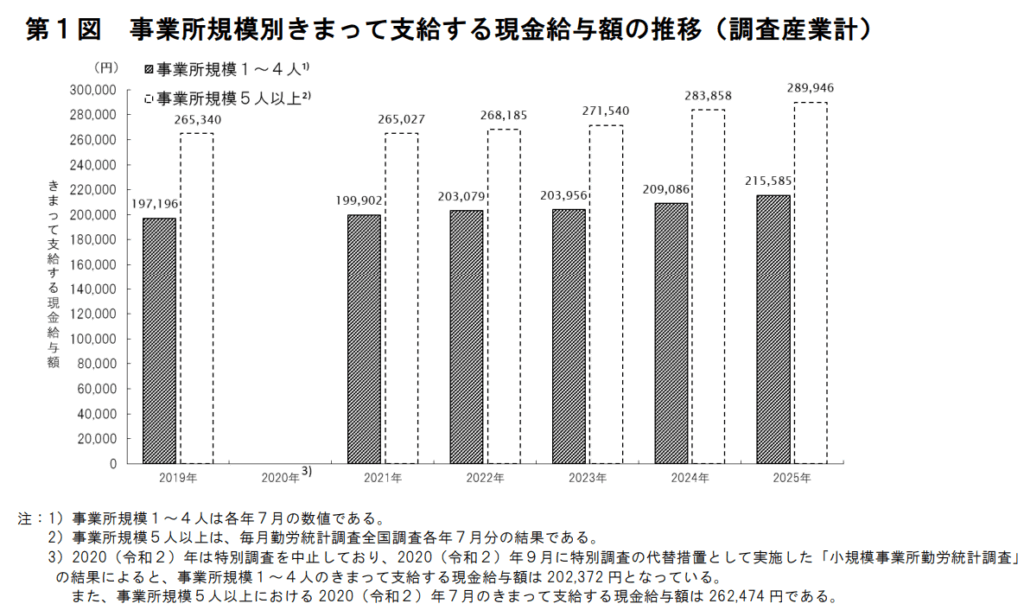 厚生労働省が、2025(令和7)年「毎月勤労統計調査特別調査」の結果を公表しました。この調査は、全国の主要産業の小規模事業所(常用労働者1~4人規模)における賃金、労働時間及び雇用の実態を明らかにすることを目的として毎年実施されています。
