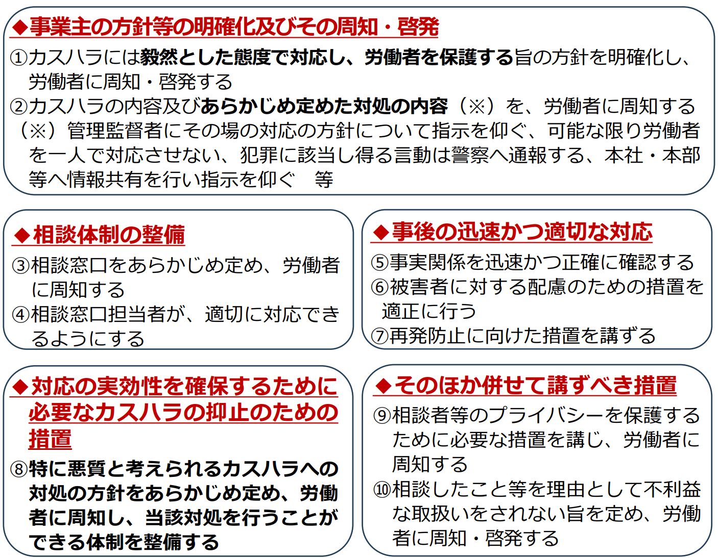 そして、事業主は、カスハラ防止のため以下の措置を必ず講じなければならないとされています。太字は、他のハラスメントで講ずべき措置とは異なる内容のものとされていますので、おおむねセクハラやパワハラなどの他のハラスメント防止措置と似たものが求められているといえるでしょう。