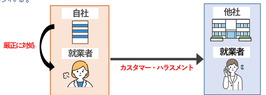 自社の就業者がカスタマー・ハラスメントを行わないとの方針を明確にした上で就業者に周知することとされています。ここでは、対応例として、カスタマー・ハラスメントを行った自社の就業者に対しては、厳正に対処する旨を就業規則等に定め、社内で周知するものとされています。