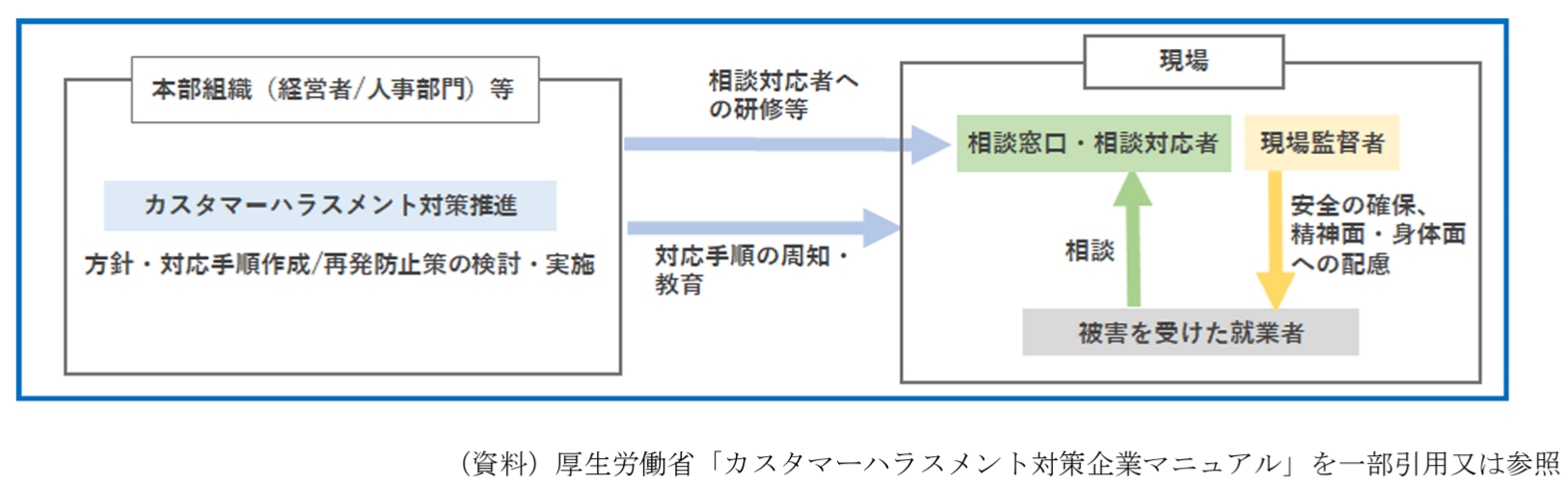 たとえば、中規模・中小規模の企業の場合(従業員6~100人)の内部手続きの例を示すと、カスタマー・ハラスメント対策推進 ⇒ 本部(経営者、人事部門責任者など) 相談対応者・現場監督者 ⇒ 就業者の上司(店舗におけるマネージャーなど)とすることなどが考えられます。