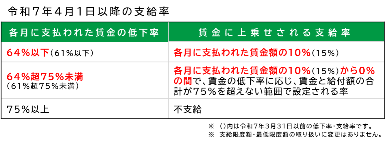 雇用保険法等の改正法の施行により、令和7年4月1日から高年齢雇用継続給付の支給率が変わります。