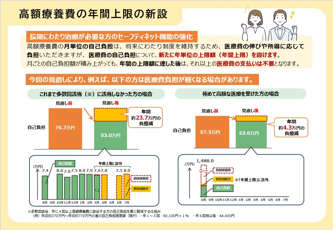 高額療養費の月単位の自己負担については、将来にわたり制度を維持するため、医療費の伸びや所得に応じて負担する見直す一方で、医療費の自己負担について、新たに年単位の上限額(年間上限)が設けられる予定です。いたがって、月ごとの自己負担額が積み上がっても、年間の上限額に達した後は、それ以上の医療費の支払いは不要となります。