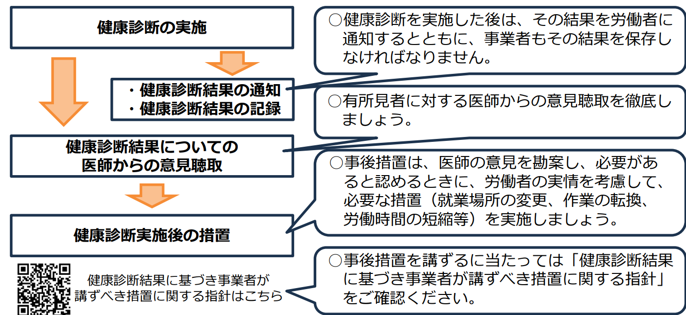 健康診断の実施、有所見者に対する医師からの意見聴取、医師の意見を勘案した必要な事後措置の