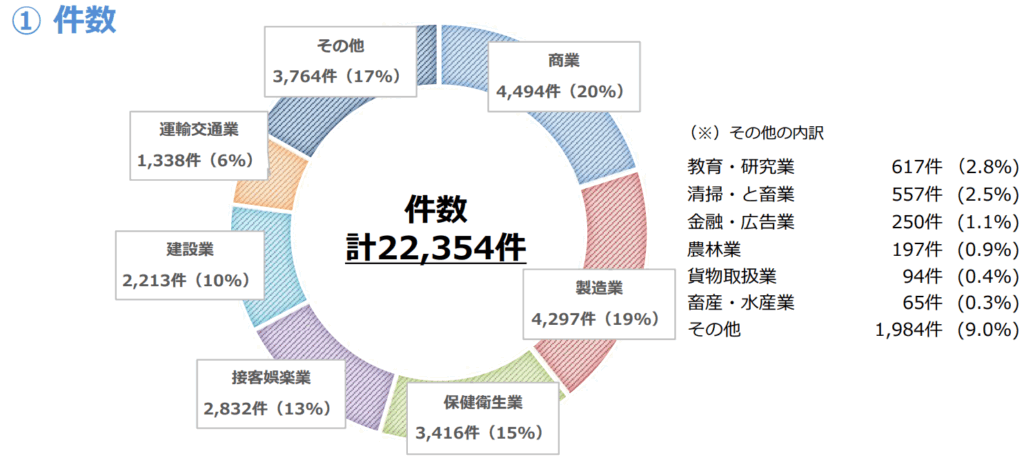業種別でみると、数の通り「商業」が最も多く、全体の20%に上りました。