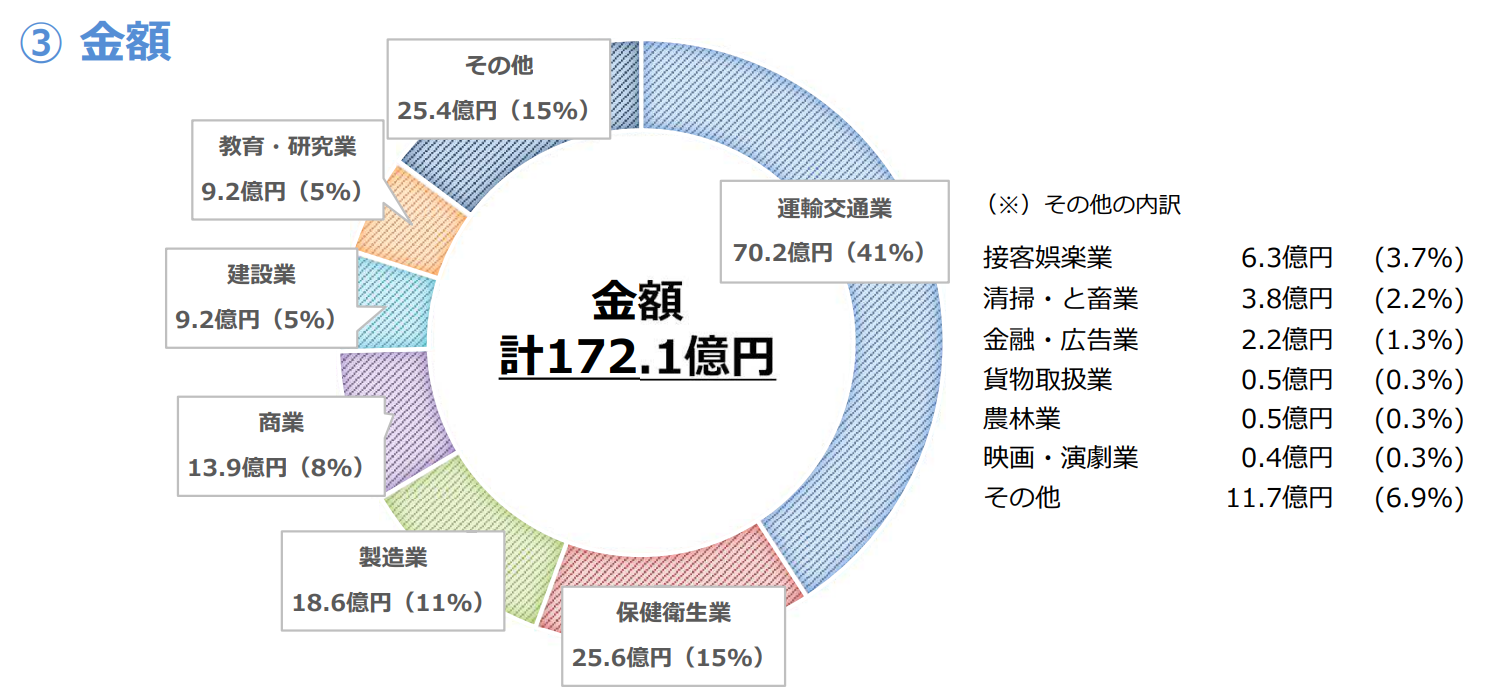 一方、金額では「運輸交通業」が全体の4割に上りました。つまり、運輸交通業は件数としては少ないものの、1社あたりの未払い賃金の額は多額にのぼるということがいえます。たとえば運輸交通業の支払金額70.2億円を件数の1,338で割ると、1件あたり約525万円になりました。これは件数が最も多い「商業」が約31万円であるのと大きな違いといえます。