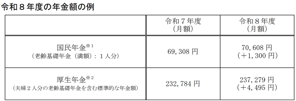 令和8年度の年金額は、名目手取り賃金変動率(2.1%)を用いて改定します。また、令和8年度のマクロ経済スライドによる調整(国民年金(基礎年金)が▲0.2%、厚生年金(報酬比例部分)が▲0.1%)が行われます。よって、令和8年度の年金額の改定率は、国民年金(基礎年金)が1.9%、厚生年金(報酬比例部分)が2.0%となります。