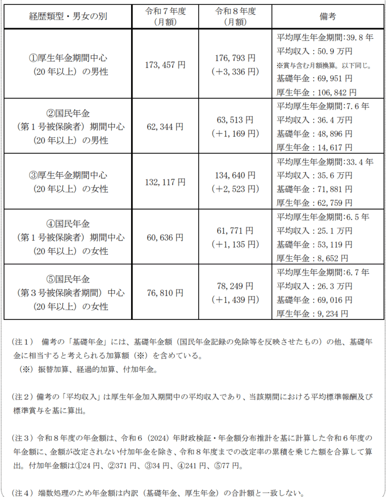 なお、令和6年の財政検証において、個人単位での公的年金加入履歴から、各世代の 65 歳時点における老齢年金の平均額や分布の将来見通し(年金額の分布推計)を作成しました。当該推計を基にした令和6年度に 65 歳になる者の加入期間や収入から、経歴類型・男女別の令和8年度の年金額を概算すると以下の通りとなります。